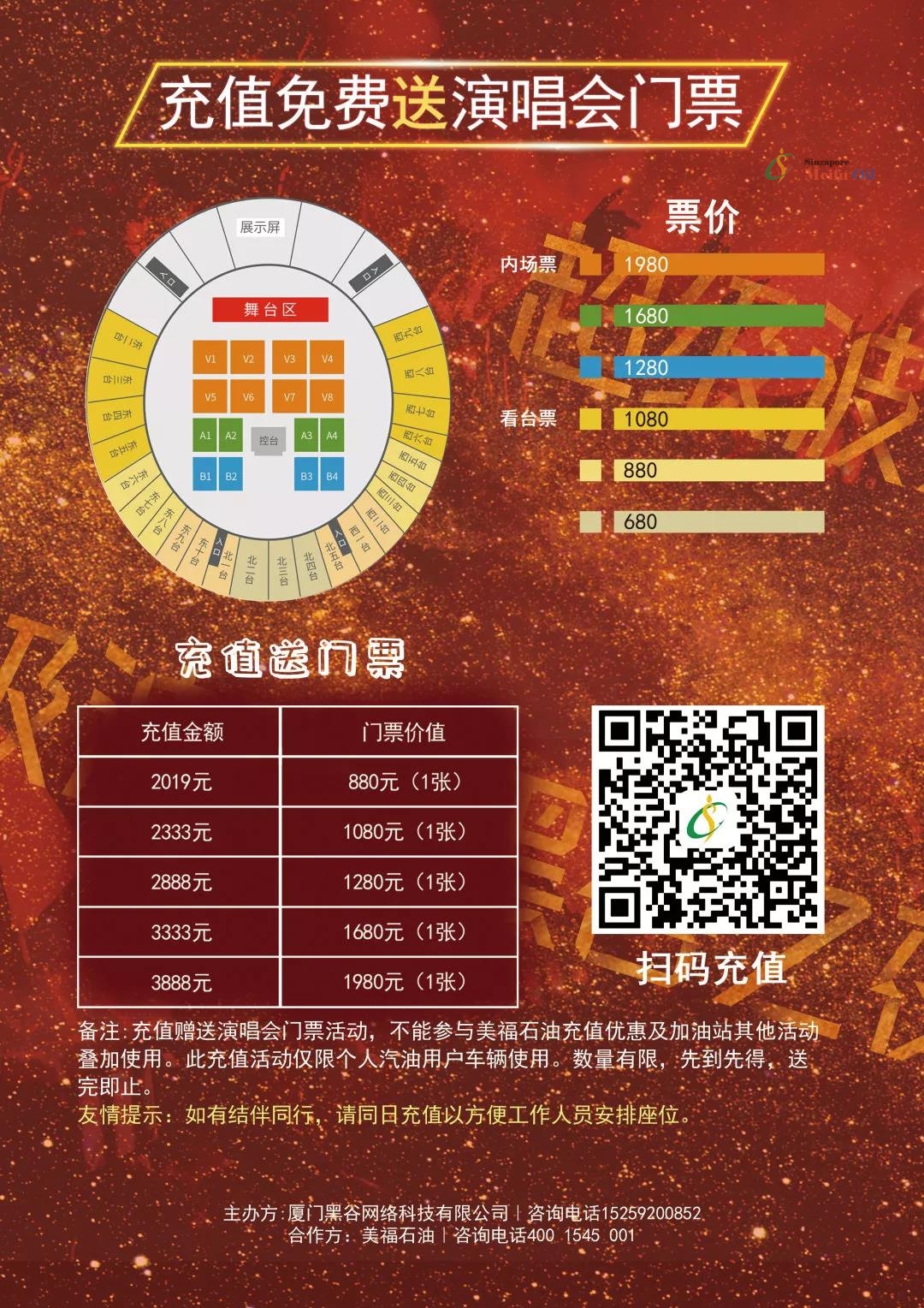 備注:充值贈送演唱會門票活動,不能與美福石油的充值優惠及加油站其他活動疊加。此充值活動僅限個人汽油用戶,車輛加油使用。數量有限,先到先得,送完即止