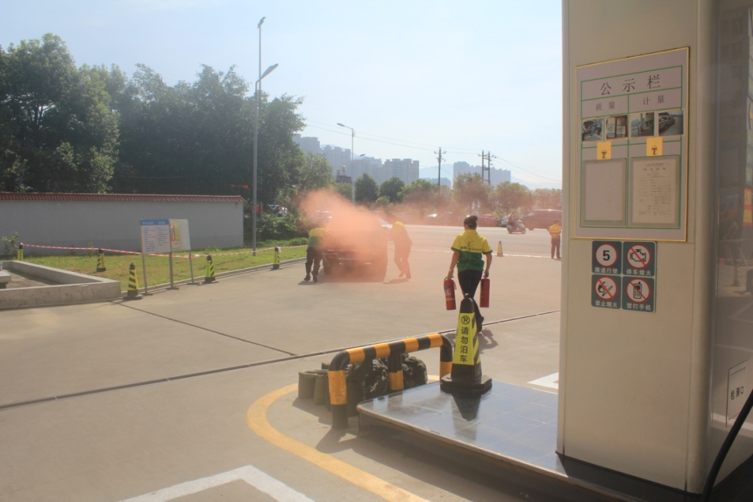 第一科目模擬加油車輛加油時(shí)著火事故應(yīng)急救援演練。進(jìn)站車輛在加油過程中突然著火,現(xiàn)場(chǎng)加油員立即停止加油作業(yè)、切斷總電源、拉響警報(bào)、疏散現(xiàn)場(chǎng)車輛及人員,其他加油員用滅火毯蓋住著火部位,用滅火器噴射,合力將著火車輛推到站外安全處。