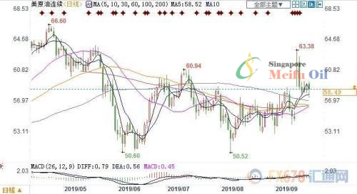 美國WTI 11月原油期貨電子盤價格周一(9月23日)收盤上漲0.4美元,漲幅0.69%,報58.49美元/桶。油價繼上周大漲近7%后,周一小幅上漲,因9月14日沙特石油設施遭到襲擊后,人們對全球供應的擔憂揮之不去,抵消了沙特石油產量恢復速度快于預期以及歐洲經濟疲軟跡象的影響。